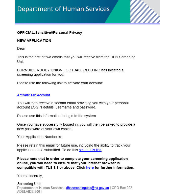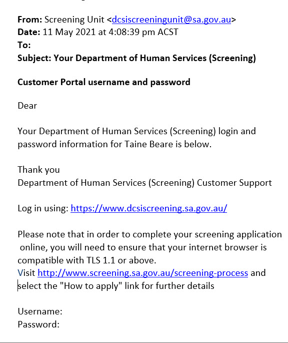 Once initiated, you will receive a series of two emails from the dhsscreeningunit@ sa.gov.au